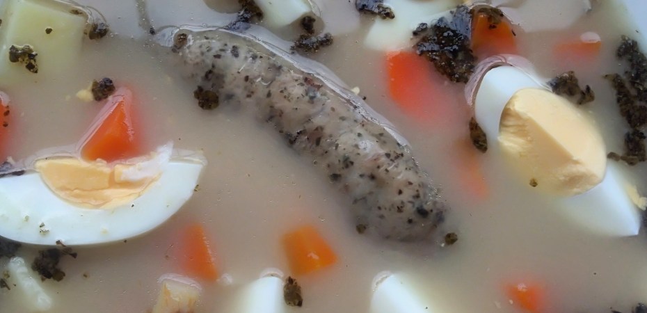 Na kiełbasie, kości oraz włoszczyźnie, opalonej cebuli, czosnku i liściach laurowych oraz ziele angielskim przygotowuję wywar. Kiedy będzie gotowy, wówczas wszystko wyjmuję. Dorzucam pokorojone w kostkę ziemniaki i gotuję. Następnie łączę z pokrojoną włoszczyzną, kiełbasą. Na końcu wlewam gotowy żurek, doprawiam majerankiem. Podaję z pieczywem i ugotowanymi jajkami.