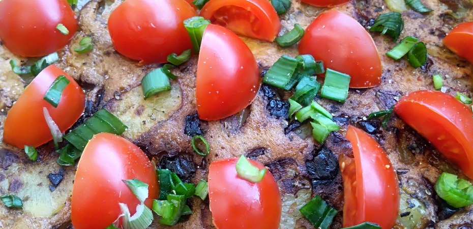 Ziemniaki obieram, myję, kroję w cieńkie talarki a cebulę szatkuję. Na rozgrzanej patelni na smalcu smażę ziemniaki, później dodaję cebulę. Kiedy wszystko będzie gotowe doprawiam majerankiem oraz solą i pieprzem oraz dodaję roztrzepane jajka. Omlet przekładam za pomocą talerza na drugą stronę. Ozdabiam pomidorkami oraz szczypiorkiem 😍😋