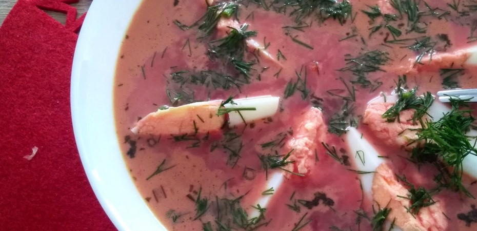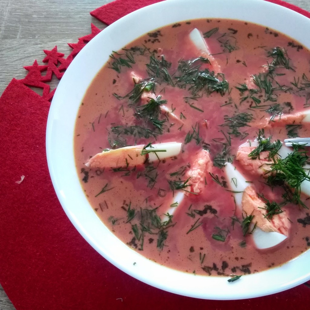 Na drobiu i obranej oraz umytej włoszczyźnie i przypalonej cebuli plus wraz z listkami laurowymi i zielem angielskim gotuję wywar. Następnie wszystko wyjmuję i dodaję starty na dużych oczkach burak i pokrojoną botwinkę oraz odrobinę soku z cytryny. Gotuję do miękkości. Marchewkę, seler i pietruszkę ścieram na tarce i łączę z zupą, doprawiam gotowym barszczem, majerankiem,na końcu dodaję śmietany. Podaję z jajkiem i koperkiem