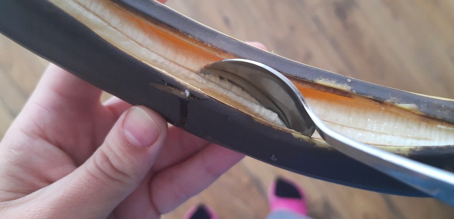 Skórkę banana przekroiłam tak jak widać na poniższym zdjęciu. Powstała kieszonka i do niej dodałam zarówno miód jak i skropiłam sokiem z cytryny. Wsadziłam do nagrzanego piekarnika na około 7-8 minut w 200 stopniach na termoobiegu. Polecam zjeść zaraz po upieczeniu 😊😋😍