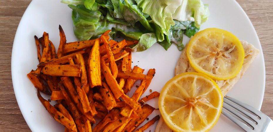 Pomimo żaru za oknem u mnie na talerzu dietetyczny obiad z piekarnika 🙂 Mianowicie frytki z batatów z ziołami, a do nich pieczony dorsz z cytryną i sałata z jogurtem naturalnym bez laktozy 😋😍 Czyli kolejna wariacja zgodna z dietą łatwostrawną. Jak było u Was? 🤔