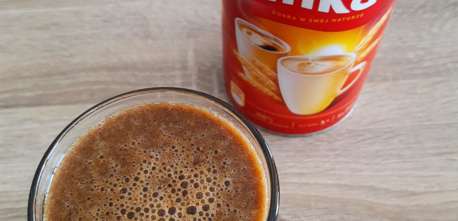 Kawę Inkę-(bo tylko taka jest dozwolona na diecie łatwostrawnej) przygotowuję w kubku. Zawartość przelewam do pojemnika, a następnie dodaję siemię lniane i pokrojonego w kawałki banana. Wszystko razem miksuję.