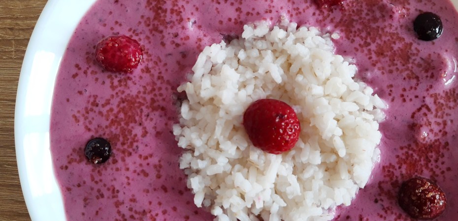 W tym czasie wyjmuję mrożonkę i jogurt oraz mleko. Kiedy ryż będzie gotowy miksuję w blenderze zarówno owoce jak i jogurt oraz mleko. Jeśli sos jest za zimny można go przez chwilę podgrzać na patelni. Wszystko razem łączę, posypuję cukrem i ozdabiam owocami oczywiście do zdjęcia, gdyż surowe i zimne nie są polecane na diecie łatwostrawnej 🙂
