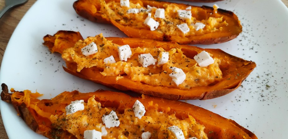Bataty myję i osuszam, a następnie nakłuwam widelcem. W całości zawijam w folię aluminiową i piekę 45-50 minut w 200 stopniach na termoobiegu. Po tym czasie wyjmuję bataty, odwijam z folii, kroję wzdłuż. Środek usuwam łyżeczką i przekładam do miseczki. Do niej dodaję pokruszoną fetę, zioła oraz sok z cytryny i farsz przekładam do batatów, które uzupełniam nadzieniem. Ozdabiam fetą i posypuję ziołami prowansalskimi. Można na 5 minut wstawić bataty do piekarnika lecz nie jest to konieczne.