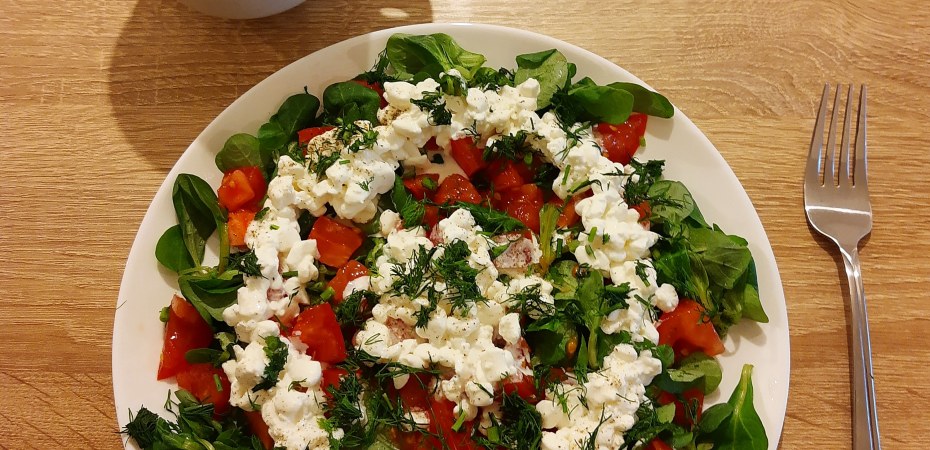 Na talerz kładę roszponkę,potem umyty i pokrojony pomidor, natomiast na górę serek wiejski bez laktozy. Wszystko posypuję pokrojonym koperkiem i doprawiam do smaku przyprawami i sokiem z cytryny. Wyszło pysznie, zdrowo i lekko 😋