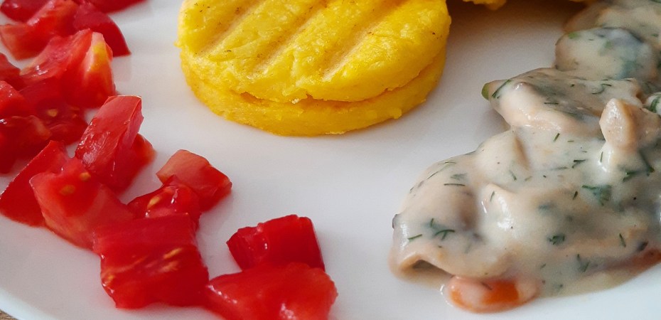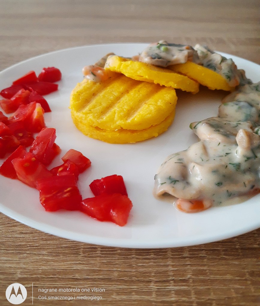 Witam, dzisiaj na obiad przygotowałam grillowaną polentę kukurydzianą z pieczarkowym sosie i pomidorem 🥰 Pysznie, lekko oraz zdrowo 😋 Jak było u Was? Mocno ściskam ☺️
