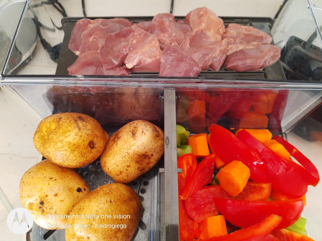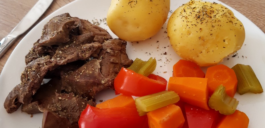 Parowar uzupełniam wodą do maksymalnej objętości i nakładam plastikową przekładkę oraz pojemniki. Do nich wkładam z jednej strony umyte ziemniaki, z boku umyte, pokrojone warzywa, natomiast do komory mięsnej wątróbkę. Ziemniaki paruję 50 minut, natomiast warzywa i wątróbkę tylko 30 minut. Ziemniaki obieram ze skórki i wraz z wątróbką na końcu doprawiam przyprawami oraz ziołami.