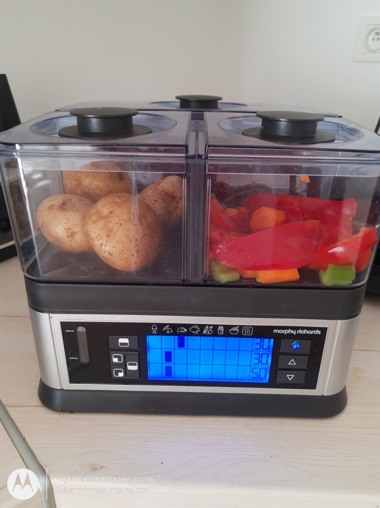 Witam, dzisiaj obiad przygotował parowar Morphy Richards Intelisteam 😆 Ziemniaki w mundurkach, wątróbka z indyka w majeranku oraz warzywa 😋 Pysznie, zdrowo i szybko 🥰 Potwierdzam, że dieta łatwostrawna przy odrobinie nakładu energii jest smaczna.
