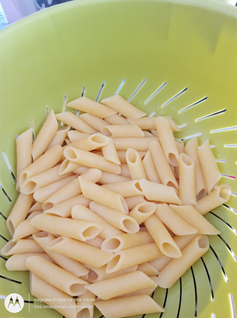 Makaron gotuję w osolonej wodzie w międzyczasie mieszając. Potem oddcedzam penne i hartuję w zimnej wodzie.
