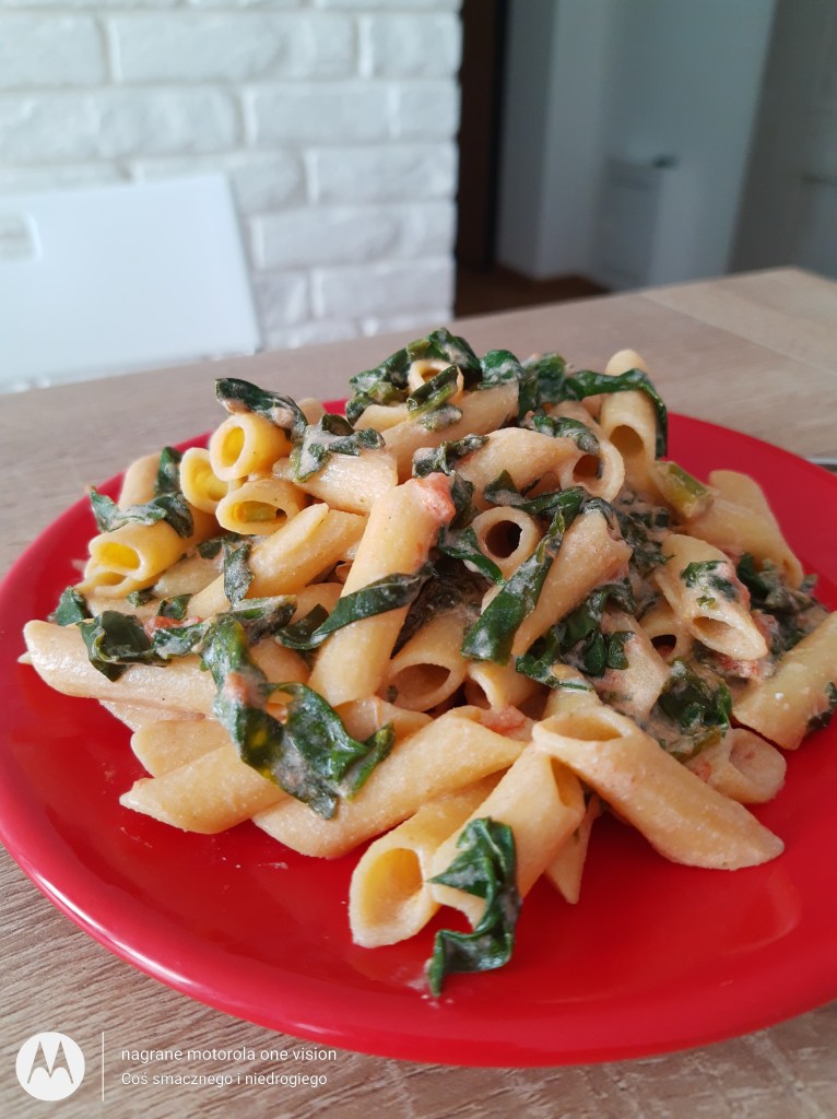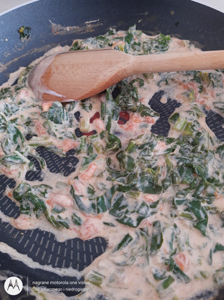 Na patelni zagotuję wodę i dodaję umyty oraz pokrojony szpinak, pomidora oraz jeszcze chwilkę ,,podgotowuję,, Doprawiam do smaku przyprawami. Sos łączę z makaronem.