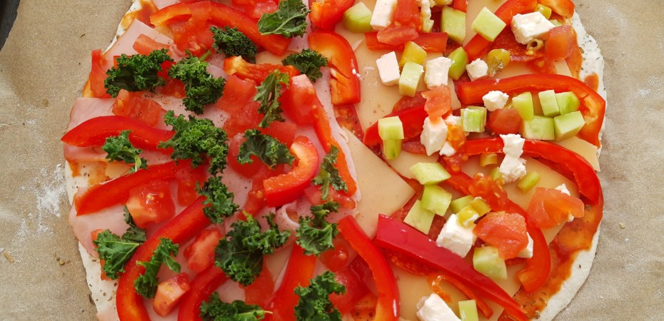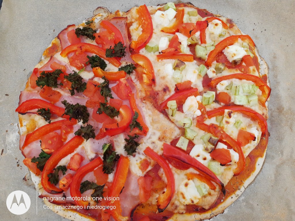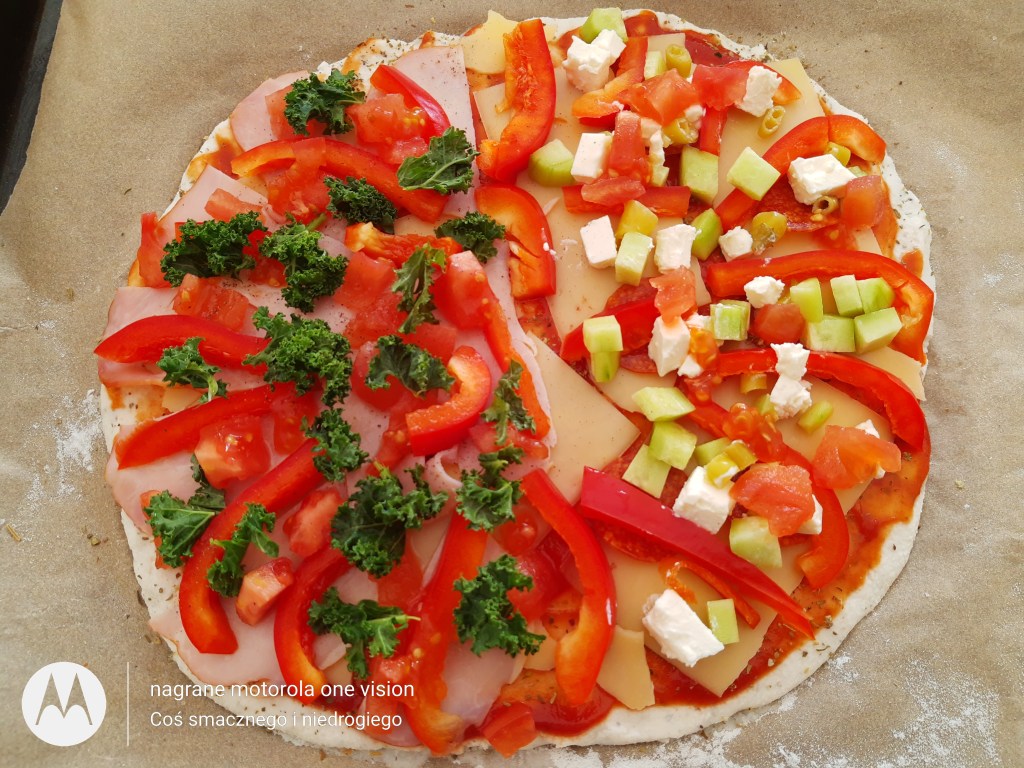 *kawałkami jarmużu (jego nie polecam na pizzę, podczas pieczenia odrobinę się przypalił).