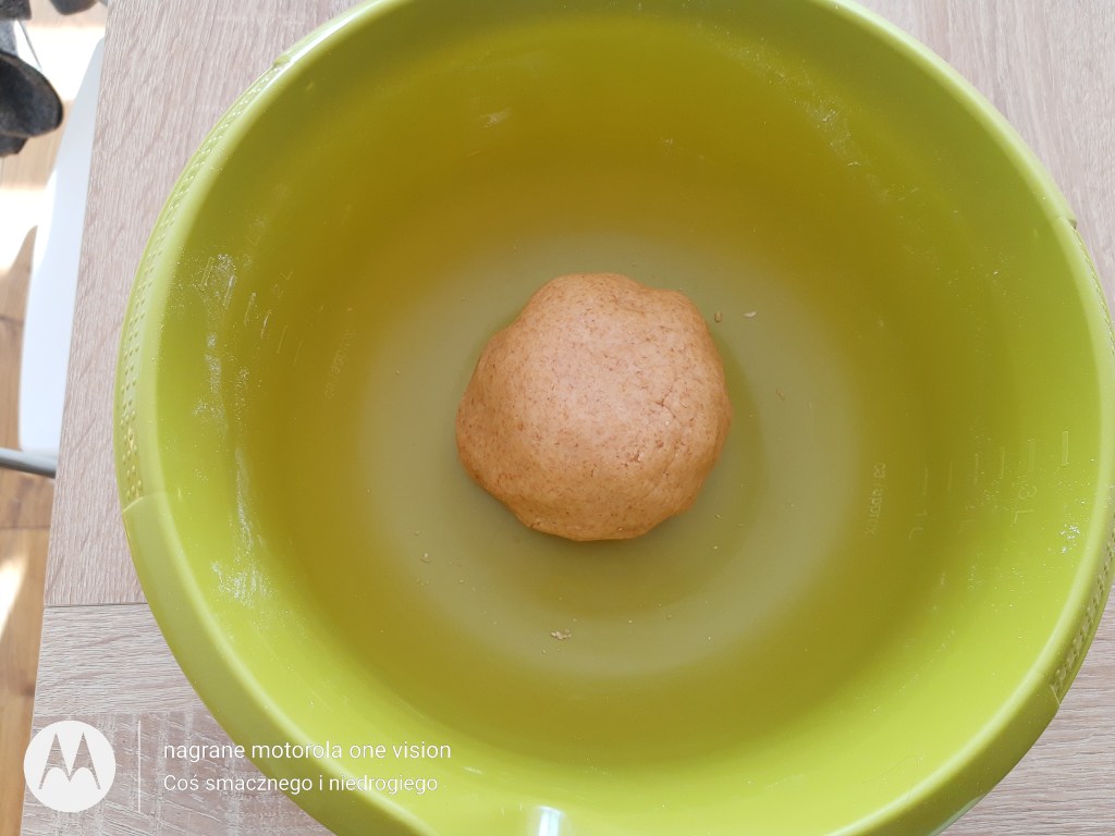 Do miski wsypuję wszystkie suche składniki i mieszam łyżką. Potem wbijam roztrzepane jajko, wodę i pokrojone w kosteczkę masło. Zagniatam ciasto tak aby nie przystawało do miski. Zawijam je folią spożywczą i wkładam do lodówki na godzinę.