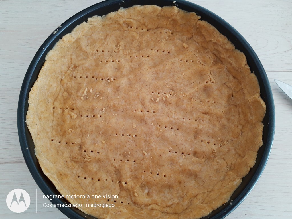 Po tym czasie rozwałkowuję tartę pomiędzy 2 kawałkami papieru do pieczenia (dzięki temu ciasto nie przyczepi się zarówno do stolnicy jak i samego wałka) i wkładam do formy.