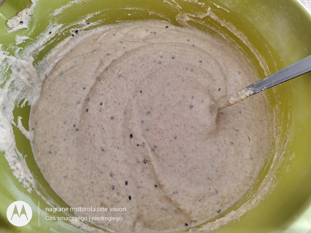 Przelewam go do formy wyłożonej papierem do pieczenia, posypuję czarnuszką oraz sezamem i wstawiam do nagrzanego piekarnika (50 stopni) na 30 minut w termoobiegu aby podrósł.