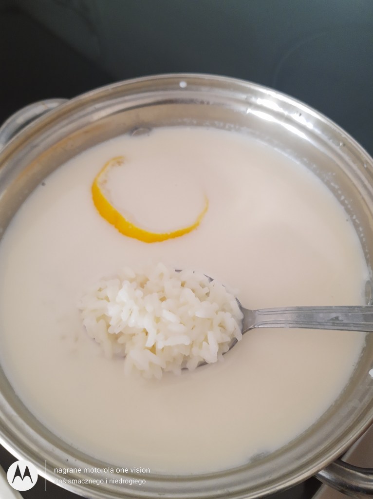 Do garnka wlewamy wodę oraz mleko ze sparzoną skórką cytrynową i wsypujemy pogdotowany ryż, który finalnie powinien wchłonąć mleko.