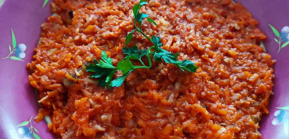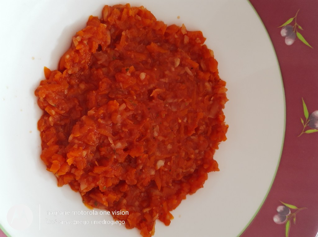 Wodę z liściem laurowym i zielem angielskim zagotowuję i dodaję warzywa. Gotuję do miękkości, a następnie odcedzam. Wyjmuję i wyrzucam liść laurowy i ziele angielskie. Warzywa ponownie umieszczam w garnku i chwilkę je prażę. Następnie dodaję: przecier pomidorowy, majeranek oraz sól i pieprz jeszcze chwilkę gotuję.