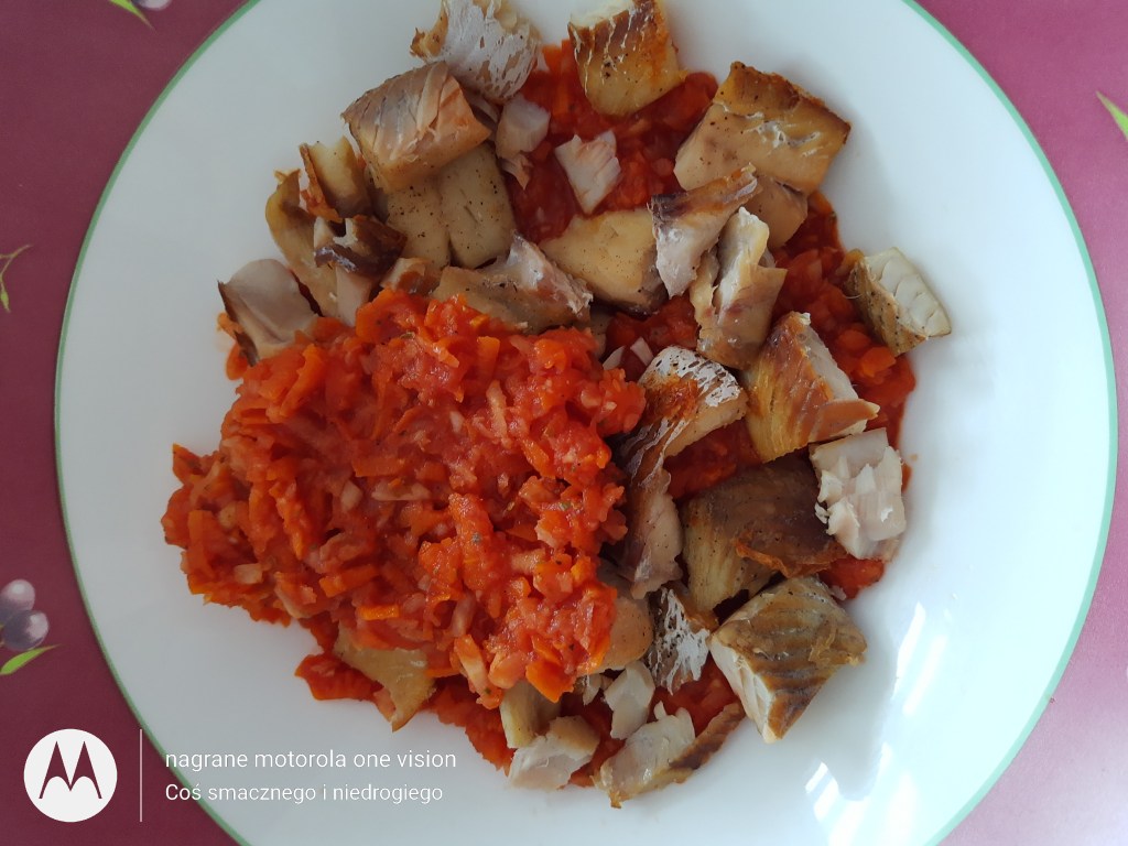 W misce układam warstwowo: warzywa-ryba-warzywa-ryba-warzywa. Gotową ozdabiam pietruszką.