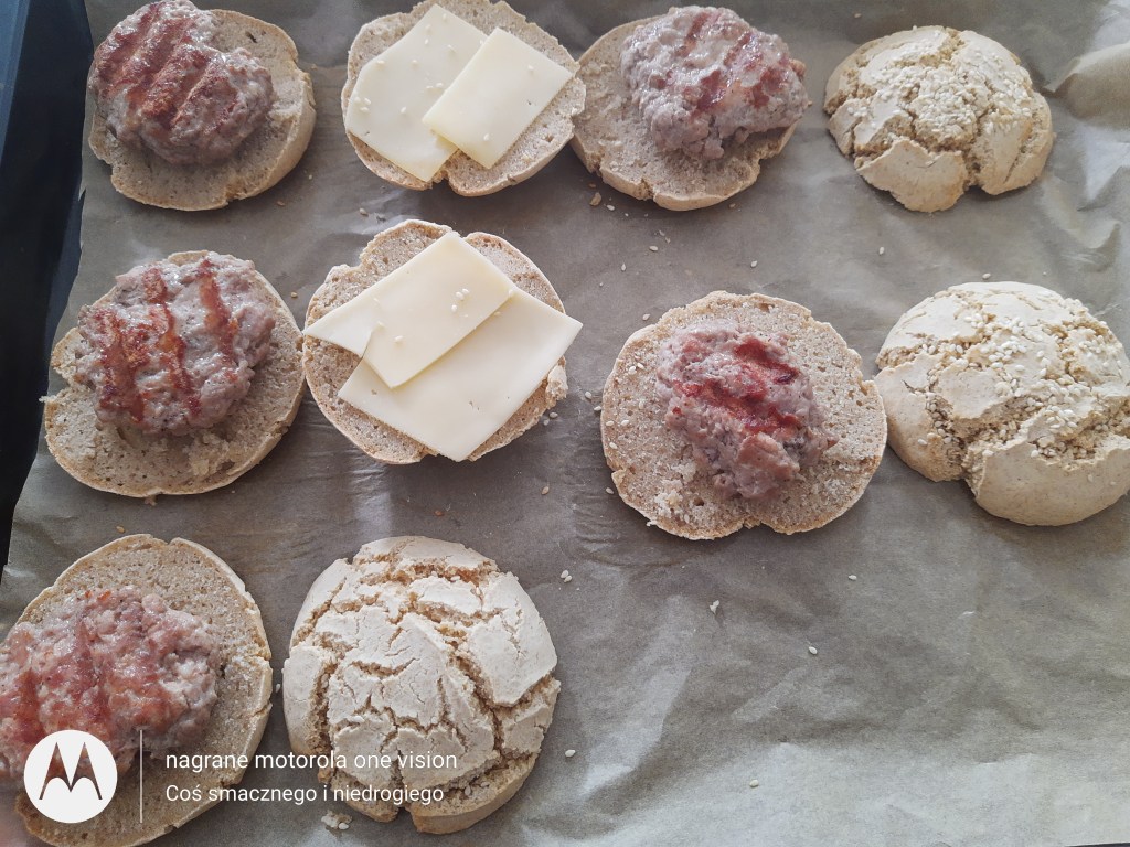 Upieczone bułki kroję na pół i składam burgery czyli dodaję mięso oraz sałatę i warzywa.