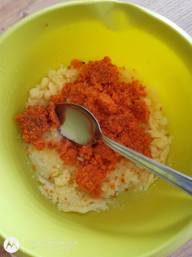 Ziemniaki myję i w mundurkach gotuję w osolonej wodzie. Potem odcedzam oraz studzę. Obieram ze skórki i ugniatam na zwartą masę.