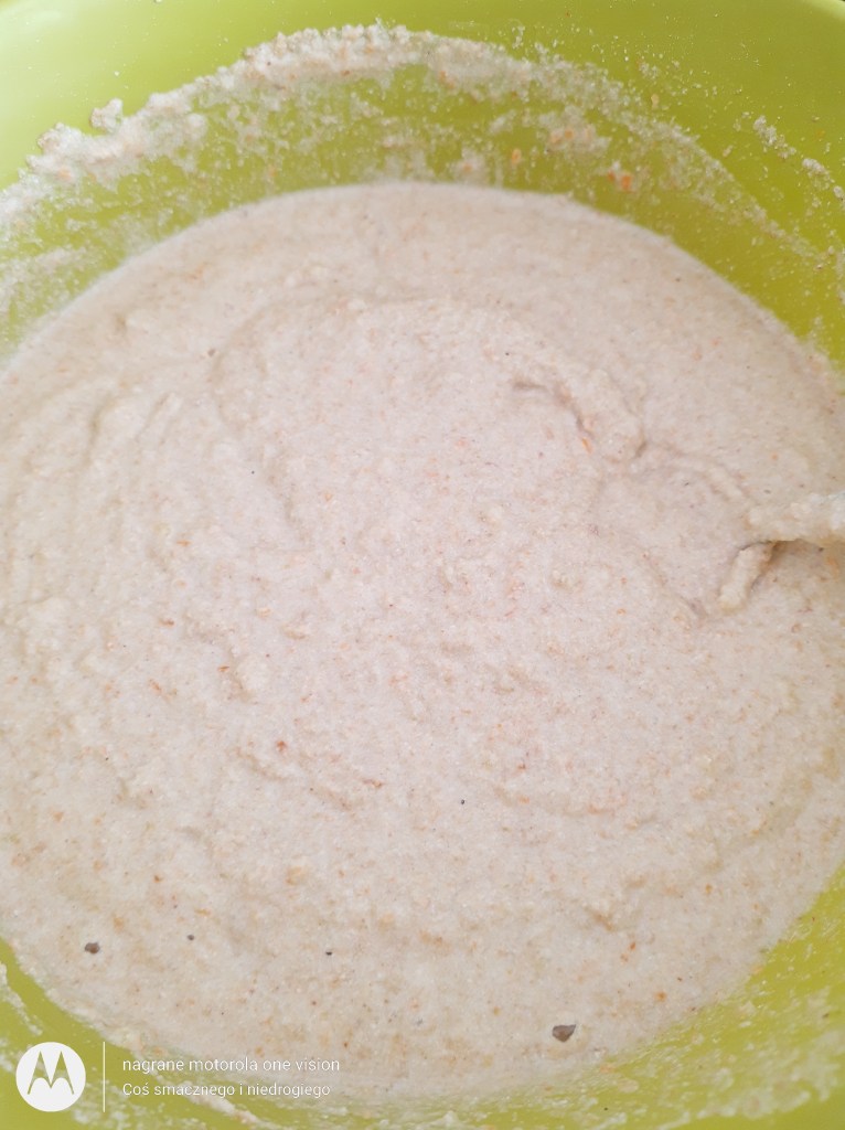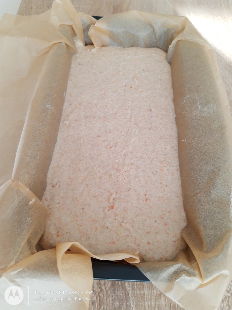 Do miski wsypuję wszystkie suche składniki oraz mieszam łyżką. Następnie wsypuję wiórki z marchewki plus ziemniaki i wszystko łączę razem. Jeśli ziemniaki nie są suche polecam rękoma wymieszać tak aby nie było grudek. Teraz powoli dolewam wodę przy jednoczesnym ciągłym mieszaniu, a na samym końcu olej. Ciasto wychodzi rzadkie, które przelewam do wyłożonej blaszki papierem do pieczenia.