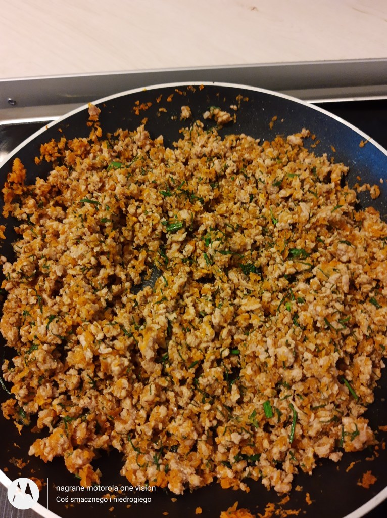 Marchewkę ścieram na najmniejszych oczkach (lub wykorzystuję pozostałą marchewkę w czasie tworzenia soku z wyciskarki wolnoobrotowej), którą dodaję do wody i mieszam. Po czym ,,podsmażam,, mięso mielone. Kiedy wszystko będzie gotowe masę doprawiam do smaku, a na samym końcu wsypuję koperek.