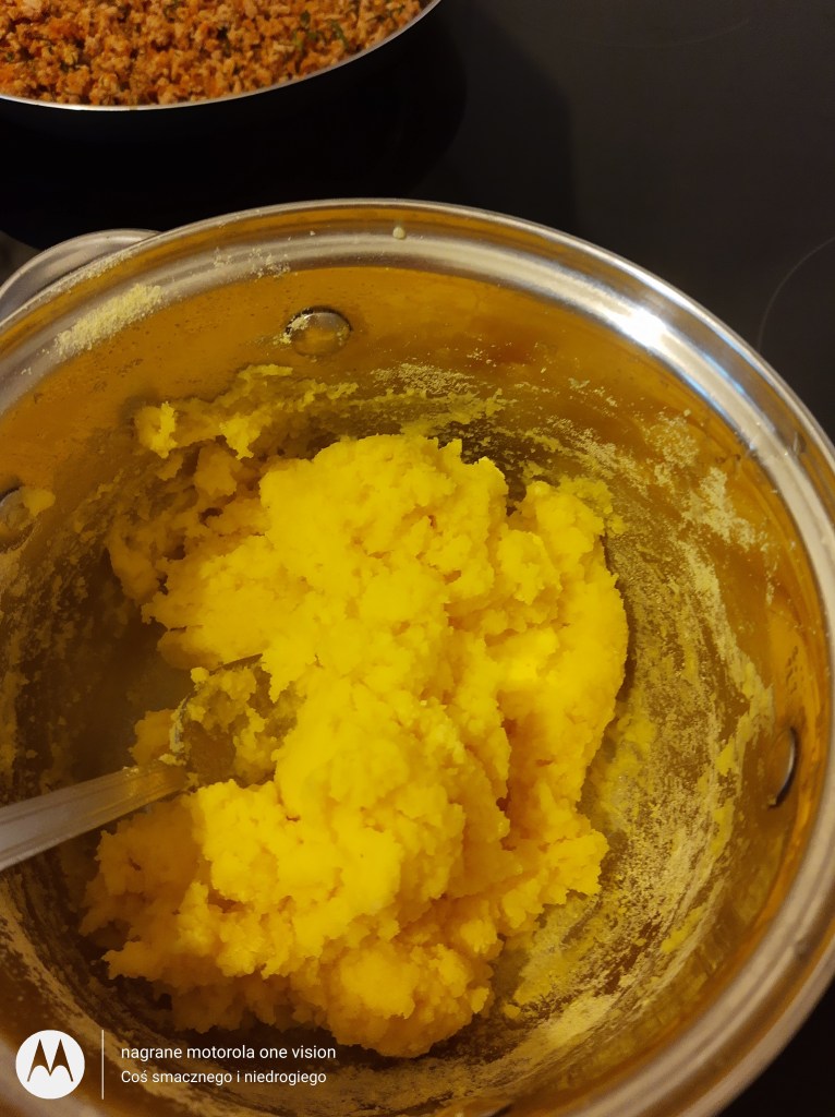 Wodę zagotowuję ze szczyptą soli i powoli nie przerywając ciągłego mieszania dodaję mąki kukurydzianej. Trzeba to robić przez chwilę, po to aby nie powstały grudki. Po tym czasie zostawiam mąkę do przestygnięcia.