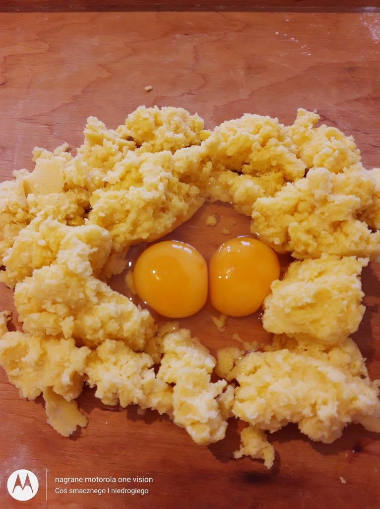 Na stolnicy wyjmuję zaparzoną mąkę, dodaję wbite jajka, olej oraz mąki i zagniatam na jednolite ciasto.