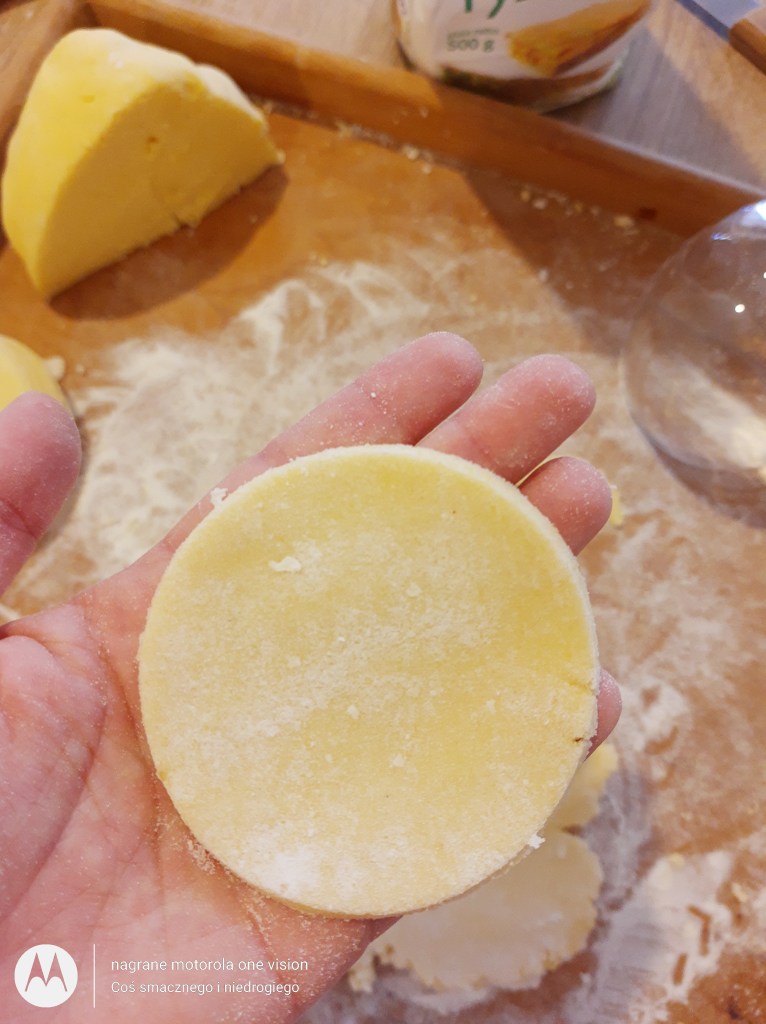 Ciasto kroję na 4 kawałki. Mocno podsypuję mąką ryżową i rozwałkowuję. Za pomocą szklanki wykrawam kółka. Potem niecałą łyżeczkę farszu kładę na środek i zlepiam pierogi według upodobania.