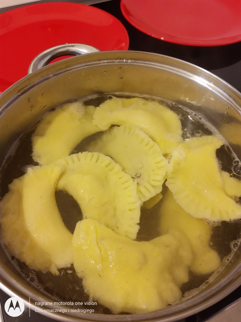 Partiami wrzucam pierogi. Kiedy wypłyną na powierzchnię jeszcze chwilę gotuję, po czym odcedzam i przekładam na talerz.