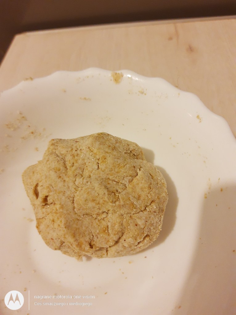 Po tym czasie w odrębnej misce wsypuję: mąkę gryczaną oraz przyprawy i wszystko razem mieszam łyżką. W mące robię ,,dołek,, i dodaję do niego: siemię lniane, wodę, olej oraz zagniatam na jednolite ciasto (jeśli jest lepiące podsypuję je mąką).