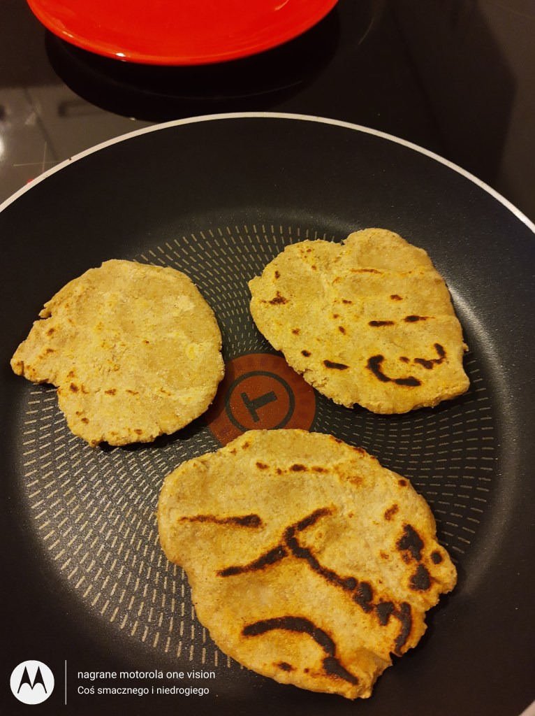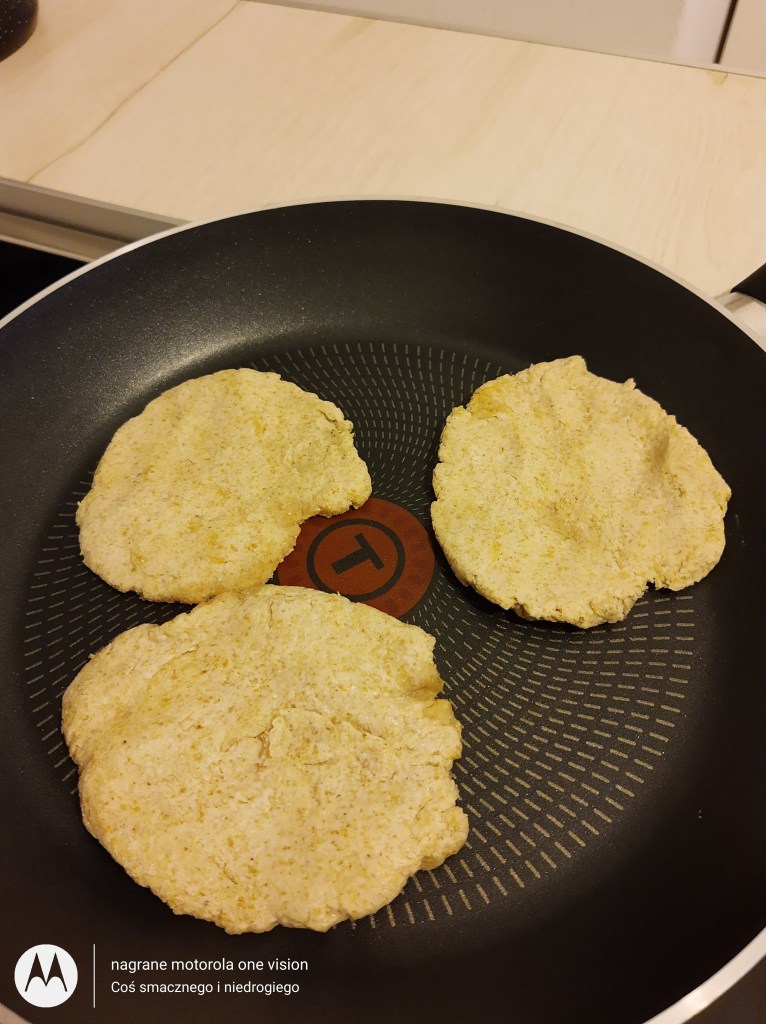 Zwilżonymi rękoma odrywam kulki, które spłaszczam (można rozwałkować) i przekładam na rozgrzaną suchą patelnię gdzie ,,podpiekam,, na rumiano (możliwe są małe przypalenia).