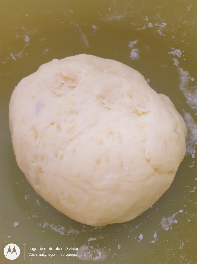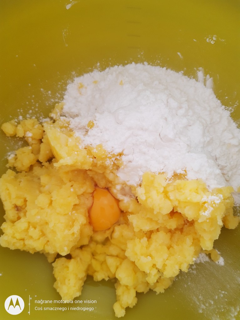 Do ziemniaków wsypuję: mąkę ziemniaczaną, sól, wbijam jajko oraz zagniatam na jednolite i zwarte ciasto.