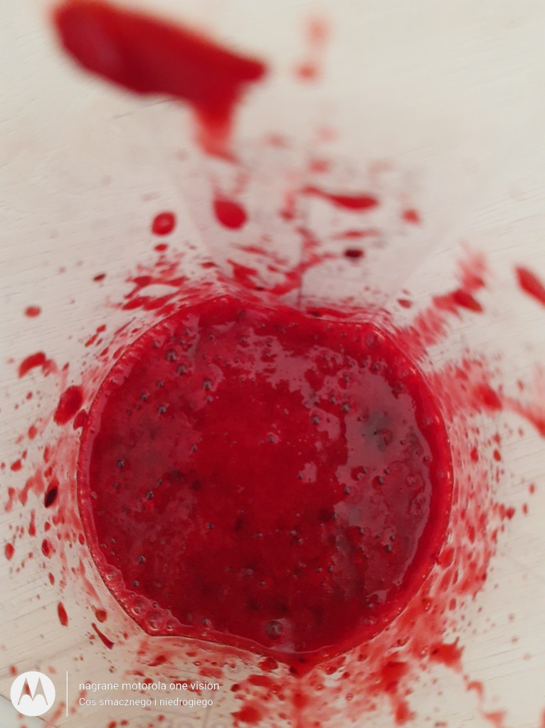 Podaję je z owocowym sosem czyli: zblendowanymi mrożonymi owocami wraz z sokiem uzyskanym po rozmrożeniu (u mnie to: truskawki, maliny, wiśnie oraz porzeczki).