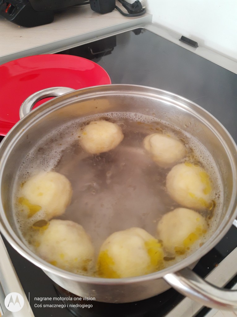 Wodę z oliwą zagotowuję i wkładam surowe knedle. Kiedy wypłyną na powierzchnię należy gotować je parę minut i po czym odcedzić.
