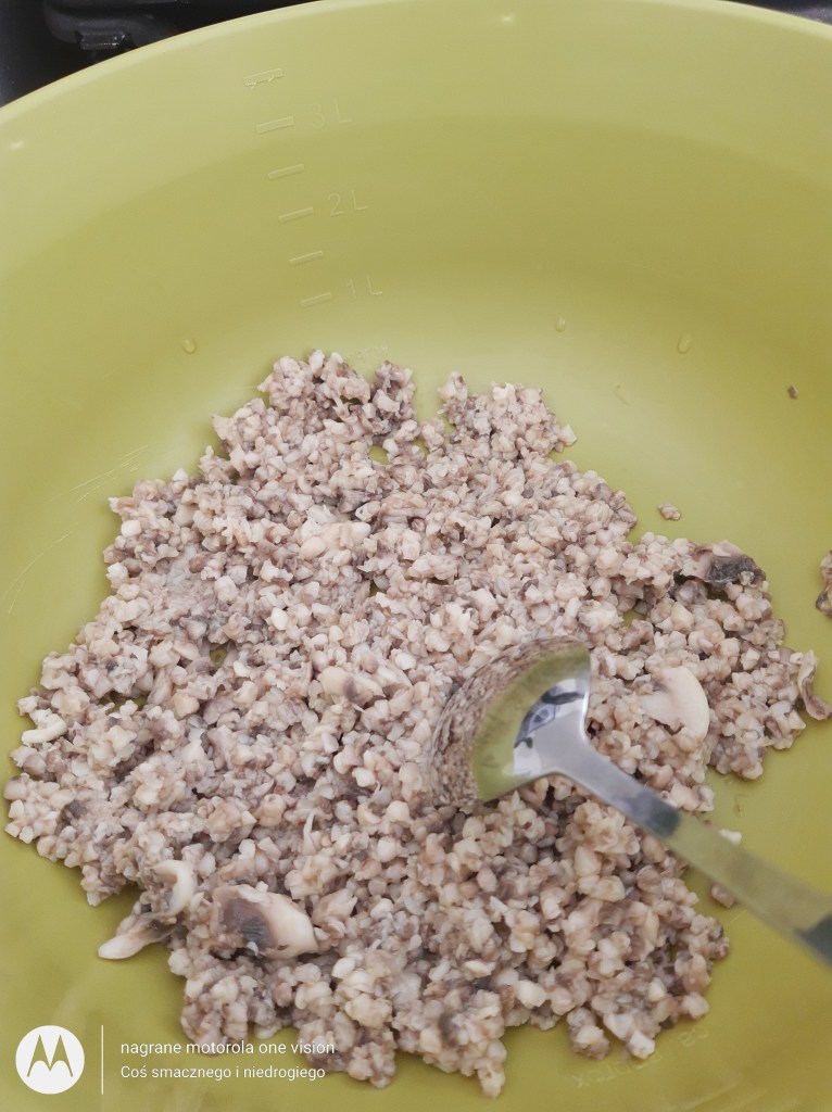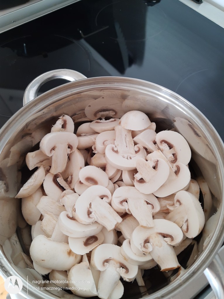 Pieczarki wstępnie czyszczę i kroję w większe kawałki. Przekładam do garnka, do którego wlewam odrobinę wody i pogotowuję. Pieczarki odcedzam na sitku i mielę w maszynce Bosh Mum 5.