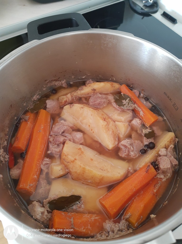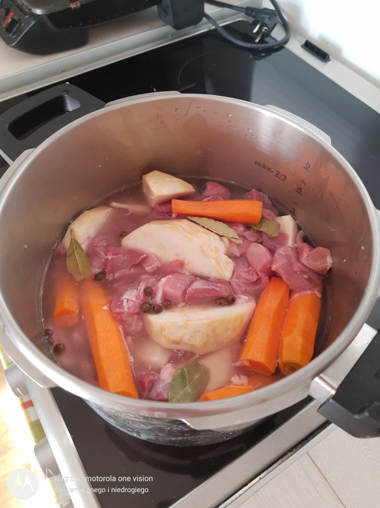 Do szybkowaru (posiadam firmy Gerlach, który służy mi dobrych parę lat) wkładam mięso wraz z warzywami, obranym imbirem i przyprawami. Zalewam do połowy wodą i zamykam. Zwiększam maksymalnie moc palnika i czekam aż szybkowar samoistnie się uszczelni. Kiedy to nastąpi od tego momentu zmniejszam temperaturę i gotuję jeszcze przez 20 minut. Czekam na swobodne rozszczelnienie.