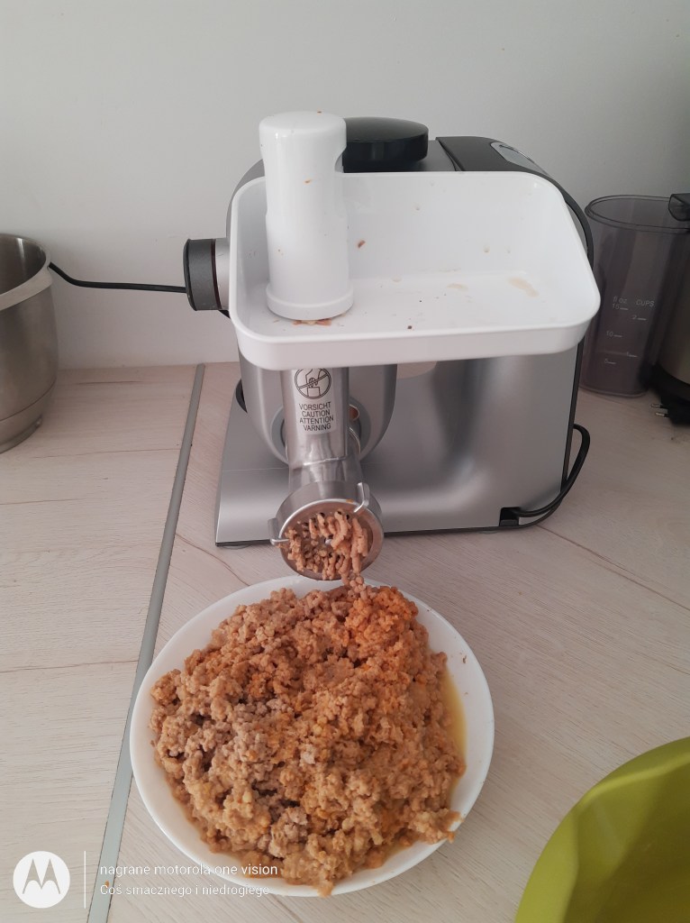 Po tym czasie wyjmuję łyżką cedzakową warzywa wraz z mięsem i wszystko razem mielę w maszynce (w Bosh Mum 5 na 3). Pozostały wywar wykorzystuję do przygotowania: zup, galaretek lub zamrażam.