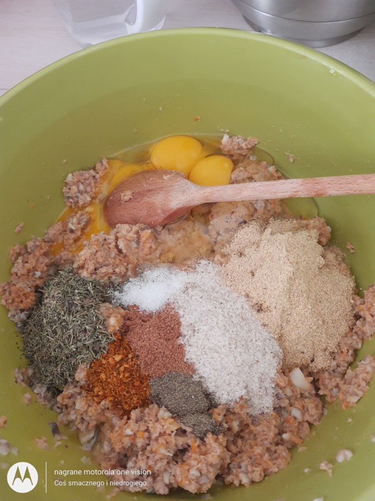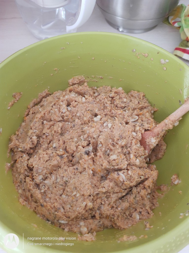 Do tak przygotowanej masy wbijam jajka, dodaję: zmielone siemię lniane, łuski babki jajowatej oraz przyprawy i parę razy mieszam łyżką.