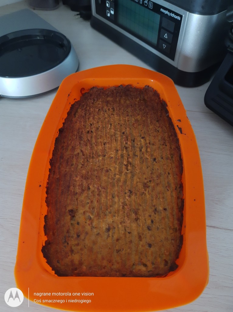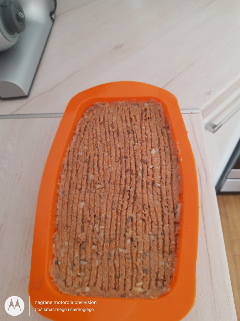 Przyszły pasztet przekładam do formy silikonowej i wstawiam do nagrzanego piekarnika na 200 stopni na termoobiegu i piekę około 40-45 minut.