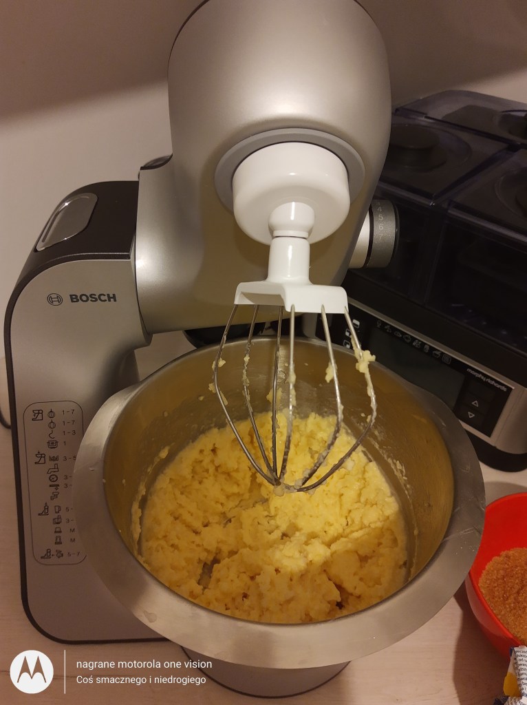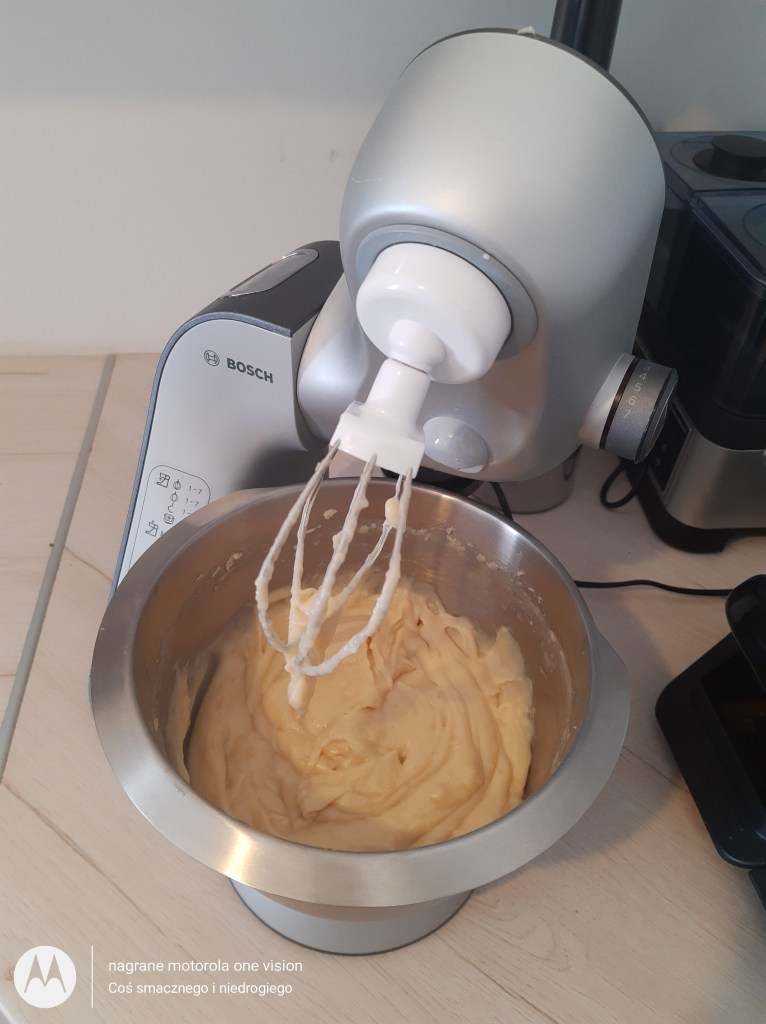 Tak przygotowane ciasto odstawiam do przestygnięcia. Kiedy to nastąpi przekładam je do misy robota kuchennego Bosh Mum 5, który włączam i w czasie pracy dodaję po jednym wbitym jajku.