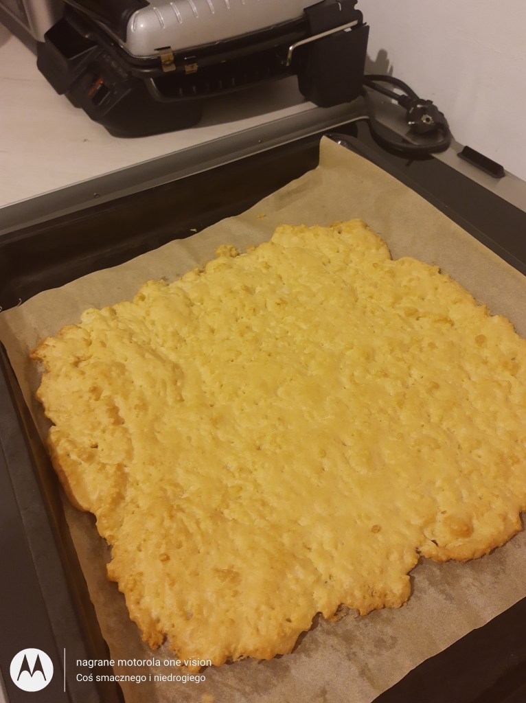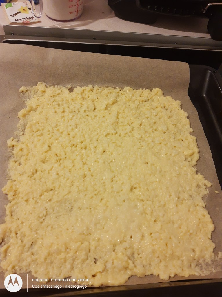 Na blaszkę wyłożoną papierem do pieczenia równo rosmarowuję ciasto na określony kształt i rozmiar oraz wkładam do nagrzanego piekarnika na 180 stopni przez około 30 minut.