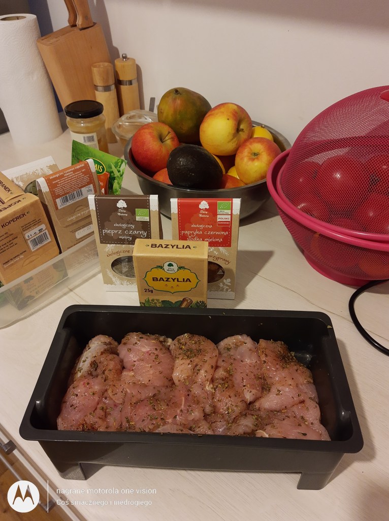 Mięso z indyka oczyszczam z błonek i kroję w większe kawałki, które oprószam przyprawami. Umieszczam je w czarnym pojemniku. Po czym wlewam mleko kokosowe, który przekładam do prostokątnej komory i podobnie jak pozostałe przykrywam.