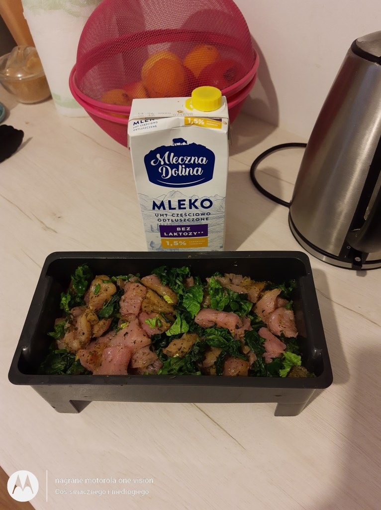 Po tym czasie mięso wyjmuję oraz kroję w większą kostkę i dodaję do niego umyty i poszatkowany pęczek szpinaku. Wszystko przekładam do odpowiedniej formy w parowarze oraz komory.