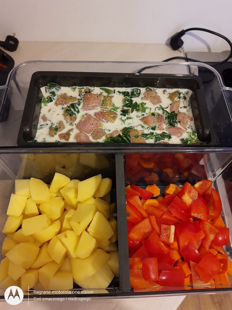 Do następnej wkładam obrane, umyte i pokrojone ziemniaki, a do bocznej wstępnie przygotowane i pokrojone marchewki oraz paprykę.