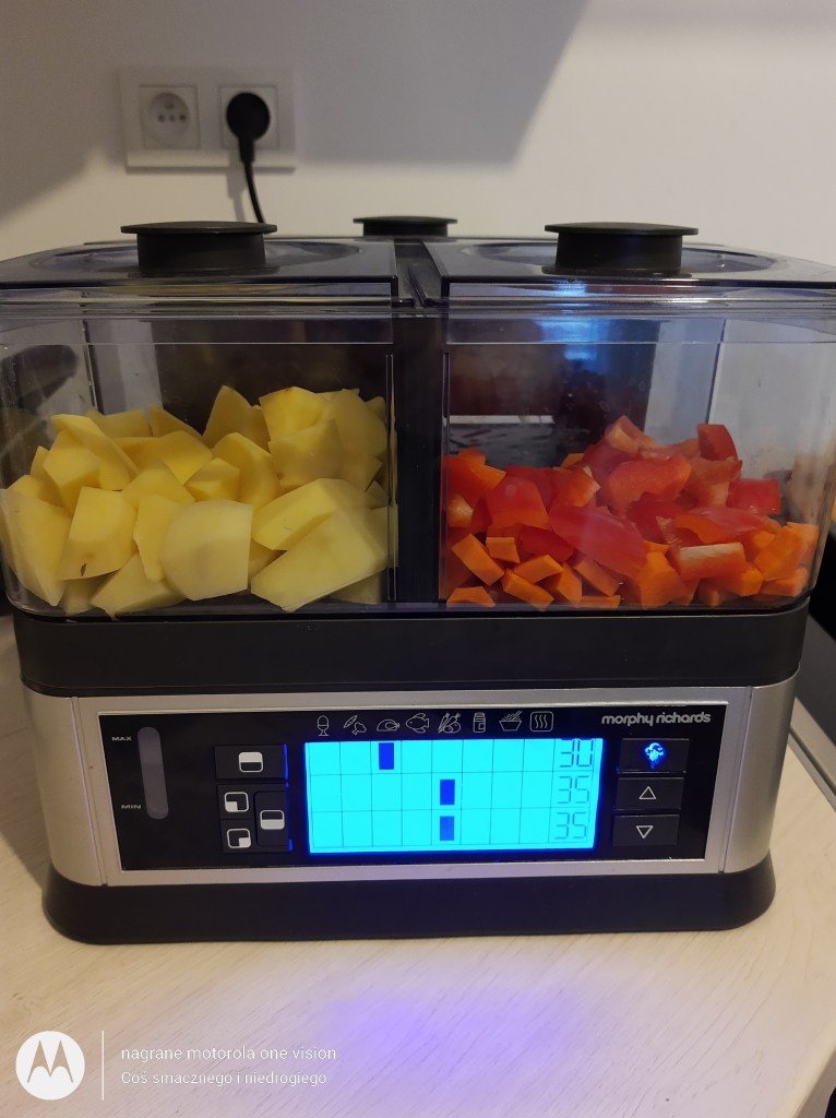 Cześć,przedstawiam Wam kolejną wariację z parowaru Morphy Richards IntelliSteam jaką wcześniej przygotowałam: to ziemniaki z warzywami oraz indyk w sosie szpinakowym 🥰😋 Prosto, zdrowo i smacznie 🥰💪