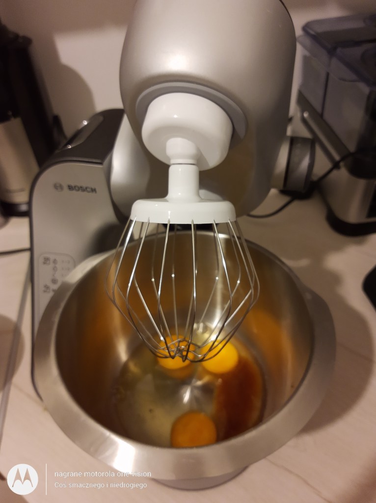 Do misy robota kuchennego Bosh Mum 5 wbijam jajka i powoli wsypuję cukier oraz cukier z prawdziwą wanilią nieprzerywając miksowania.
