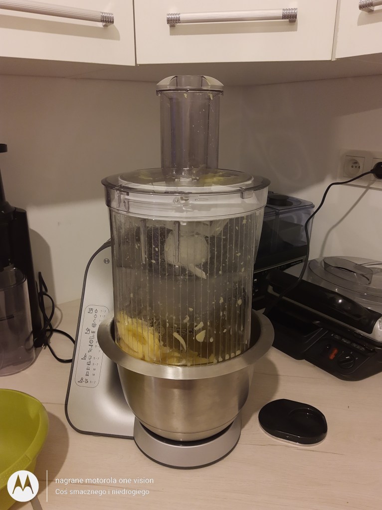Ziemniaki obieram oraz myję i ścieram na frytki w Bosh Mum 5 na specjalnej nakładce. Wychodzą lekko zaokrąglone od tradycyjnych krojonych nożem.