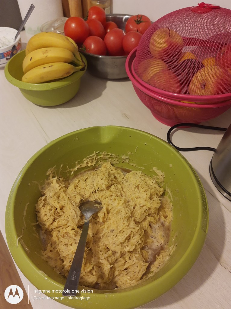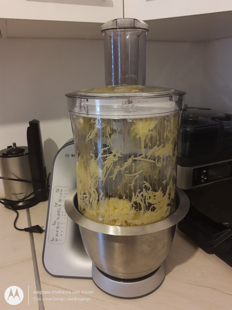 Ziemniaki obieram oraz myję i ścieram na średnich oczkach w Bosh Mum 5. Zajmuje to jedynie chwilkę.