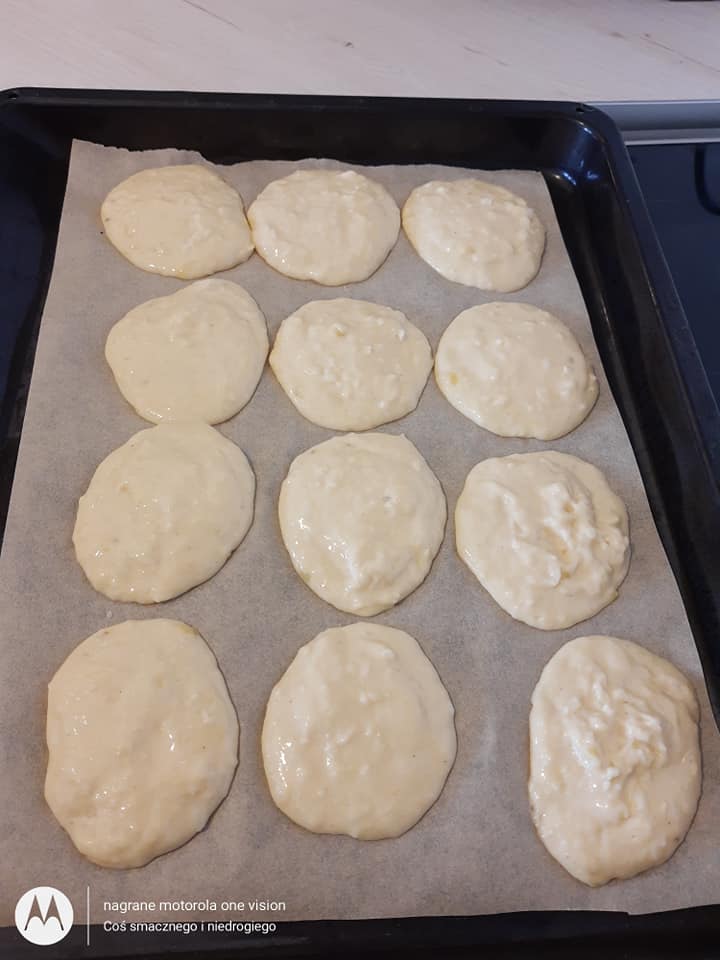 Na blaszkę wyłożoną papierem do pieczenia łyżką namoczoną w wodzie nakładam ciasto.
