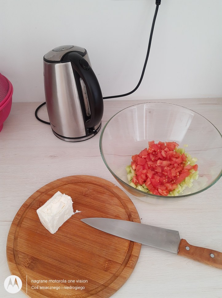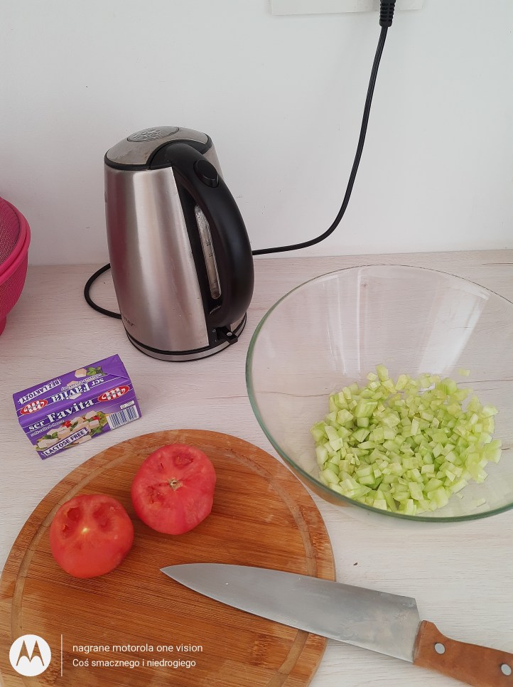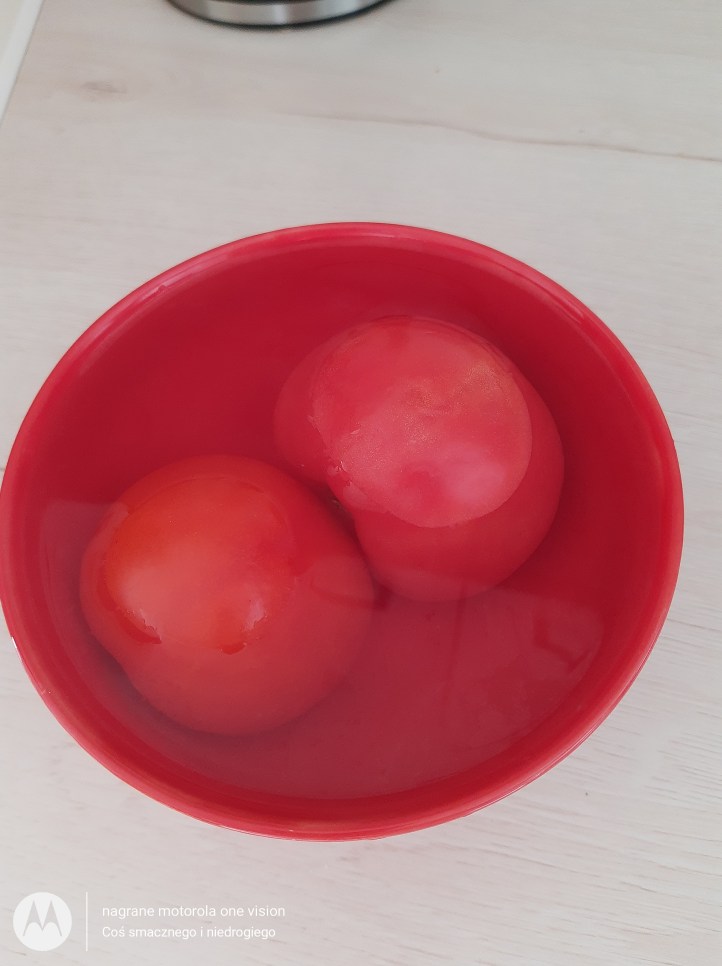 Pomidory sparzam we wrzątku oraz obieram ze skórki, po czym szatkuję.